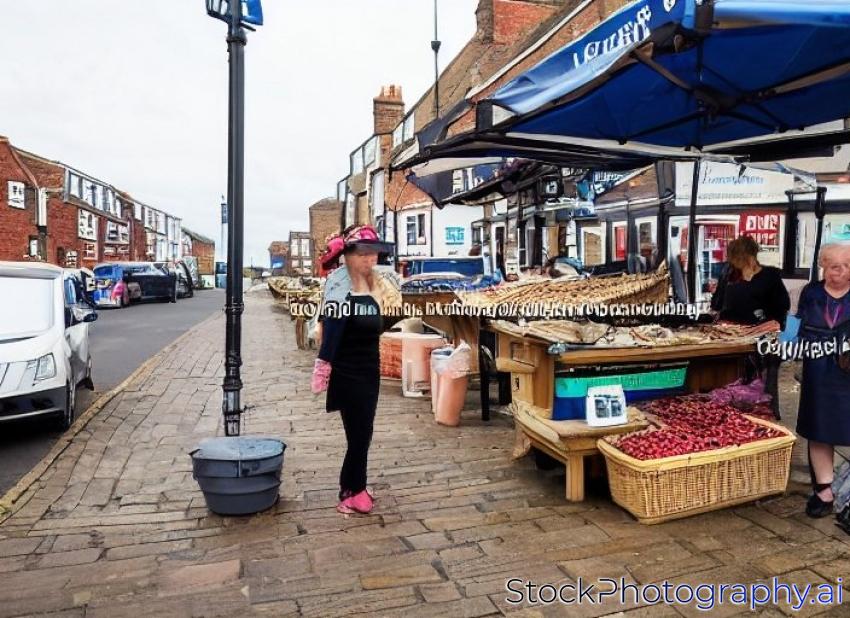 WHITBY, NORTH YORKSHIRE, UK - JULY 28, 2017: A woman waits to be served at a shellfish stall in the fishing town of Whitby
