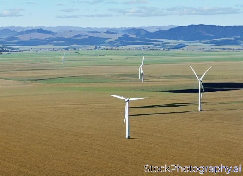 Wind turbines on farmland around New Zealand's Manawatu region.