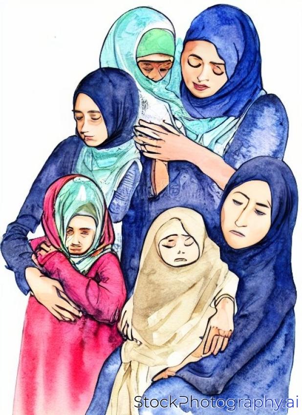 Woman and children, refugees. Muslim family. Hand drawn mother with crying kids. Watercolor sketching isolated illustration.