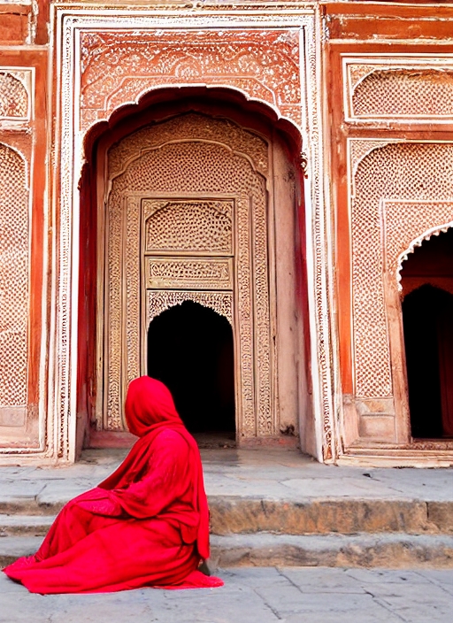 Woman in red scarf sitting near Lotus gate in City Palace of Jaipur, Rajasthan, India
