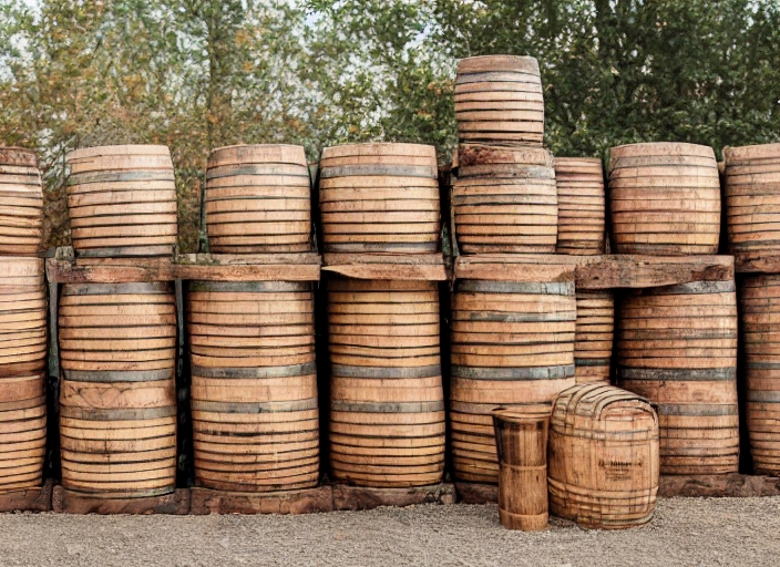 Wooden wine oak barrels stacked in straight rows in order