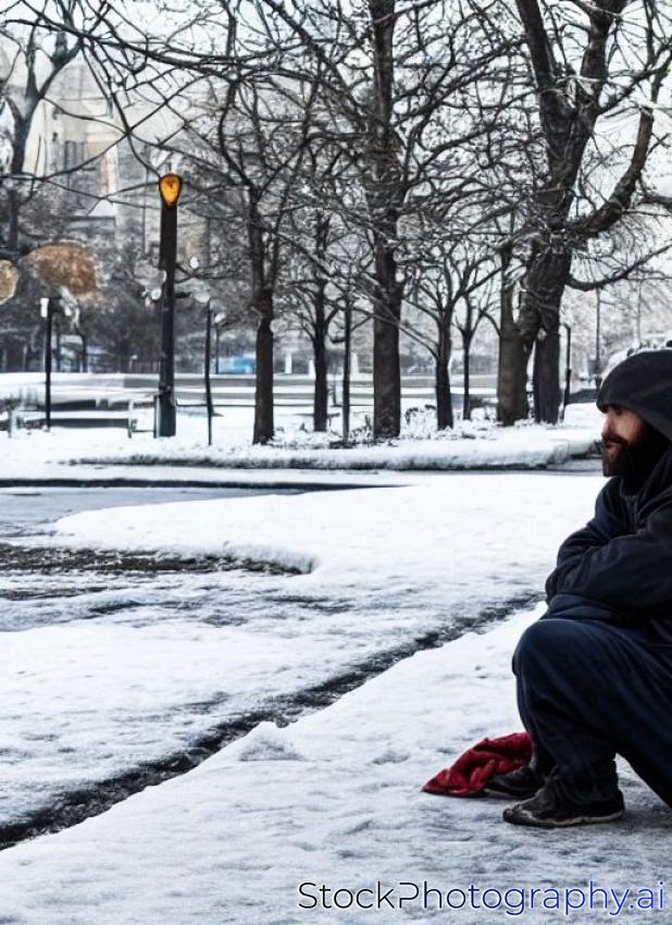 Young hungry homeless man in winter city park looking for job