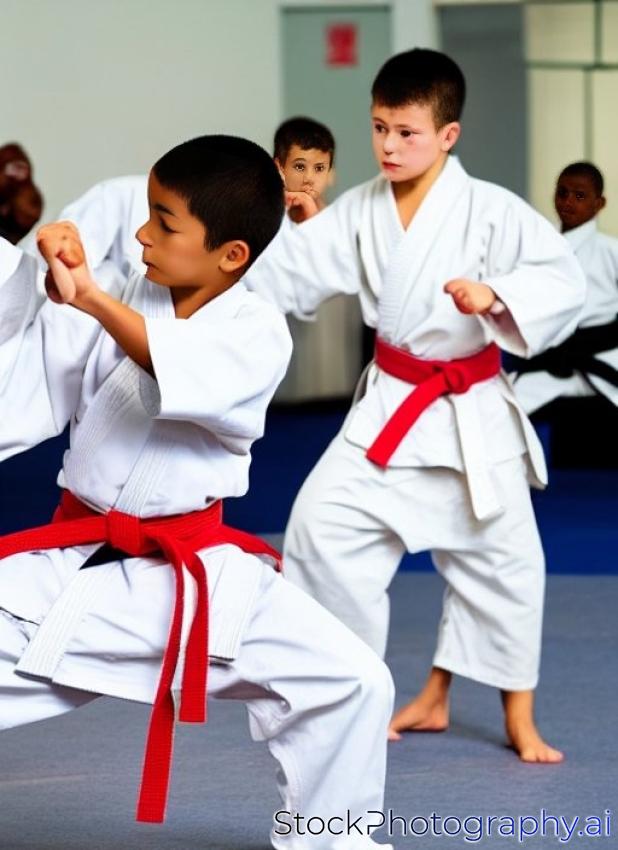 Young boy karate practitioner executing a kata