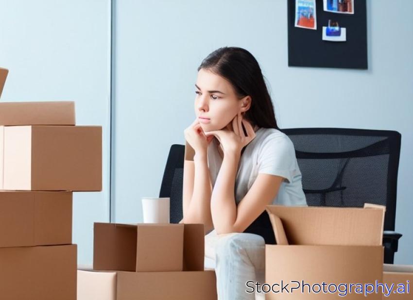 Young dismissed female worker in office sitting near carton box with her belongings. Getting fired concept.