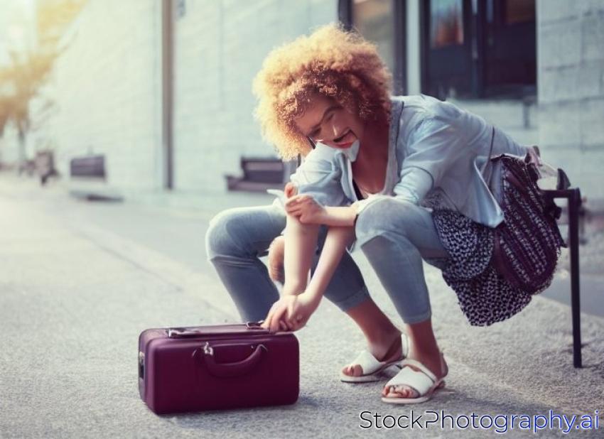 20s 25-30 years adult bag carrying caucasian color image facial expression fear female holding image indoors jeans journey jumping lifestyles long hair luggage mouth open one person one woman only only women people red running smiling speed straight hair studio shot tall tourist traveling uniform urgency vacations vertical white women young adult-