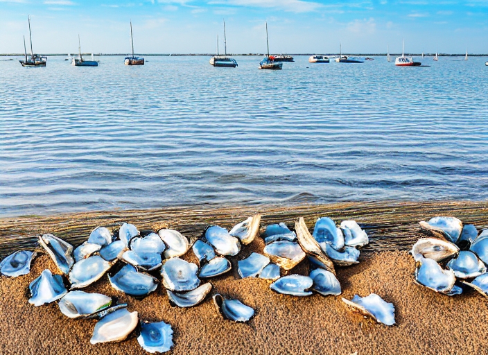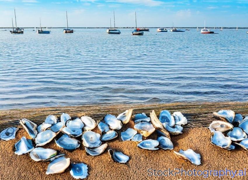 Zeeland, the Netherlands. Oyster beach on to coastal area of lake Grevelingenmeer near the city of Scharendijke. Coastal landscape with oyster shells, blue sky and sailing boats on the lake.