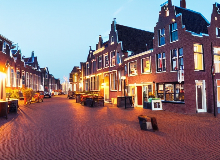 Zierikzee, The Netherlands - October 5, 2016: Houses at night at the Havenplein in Zierikzee in Zeeland with people, The Netherlands.
