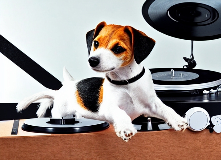 a cute jack russell dog with turntable djing, a disco setting. Dj Woof