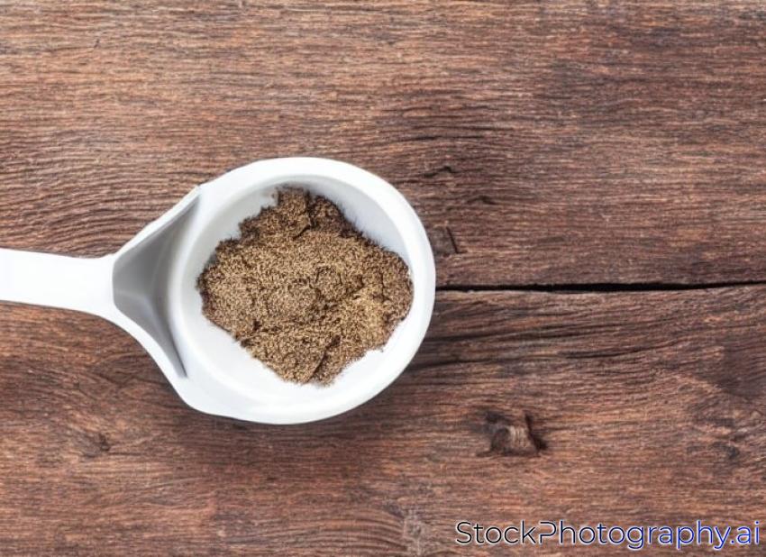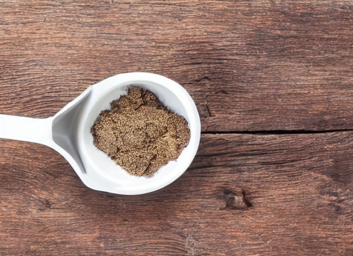 a measuring cup of organic freeze-dried maqui fruit (Aristotelia Chilensis) powder on a grunge wooden background