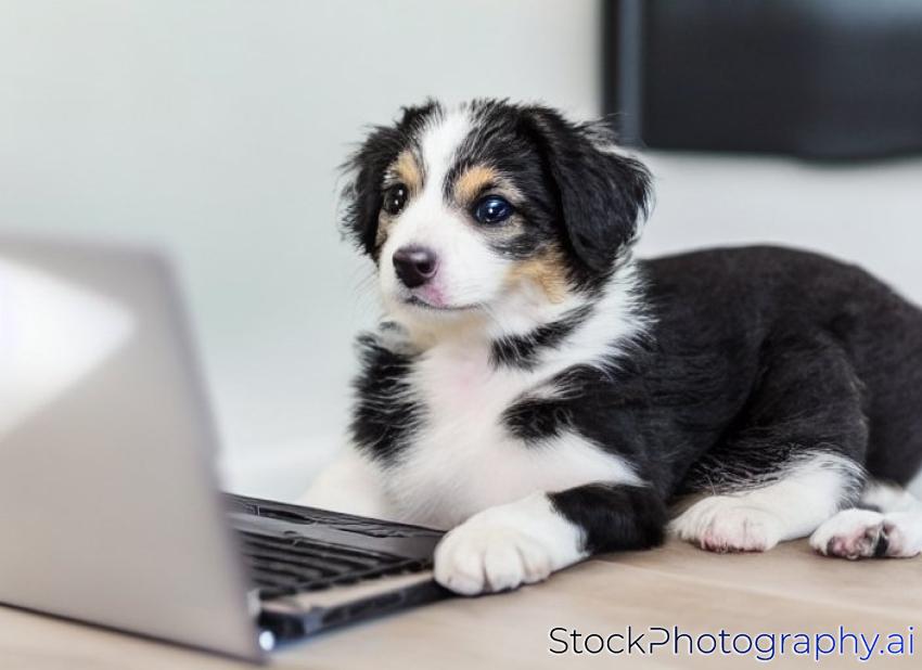 adorable mixed breed puppy working on a laptop