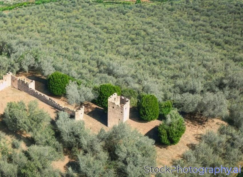 aerial view to medieval castle Monteriggioni and olive trees in Tuscany in Italy from drone