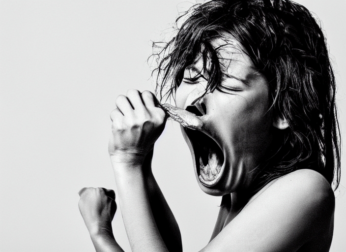 angry nude girl screaming on black background, monochrome
