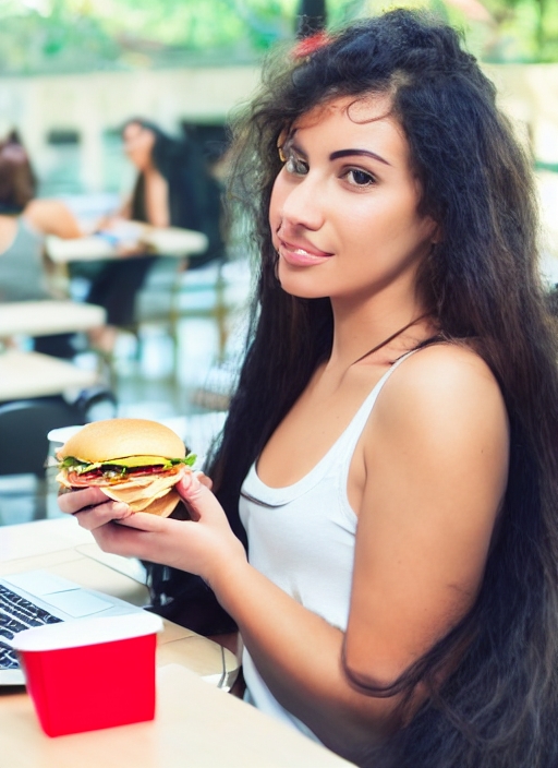 beautiful brown eyes buns cafeteria cheerful computer copy space cute eating enjoy fast food fast food restuarant fat female food french fries girl gluten hamburger happiness happy high school student hispanic hispanic woman hungry indulge ketchup lap top latin long hair meat messy one person one woman only pretty pretty young woman red sitting smiling technology teenager thirties unhealthy eating vertical well being work at home young adult-