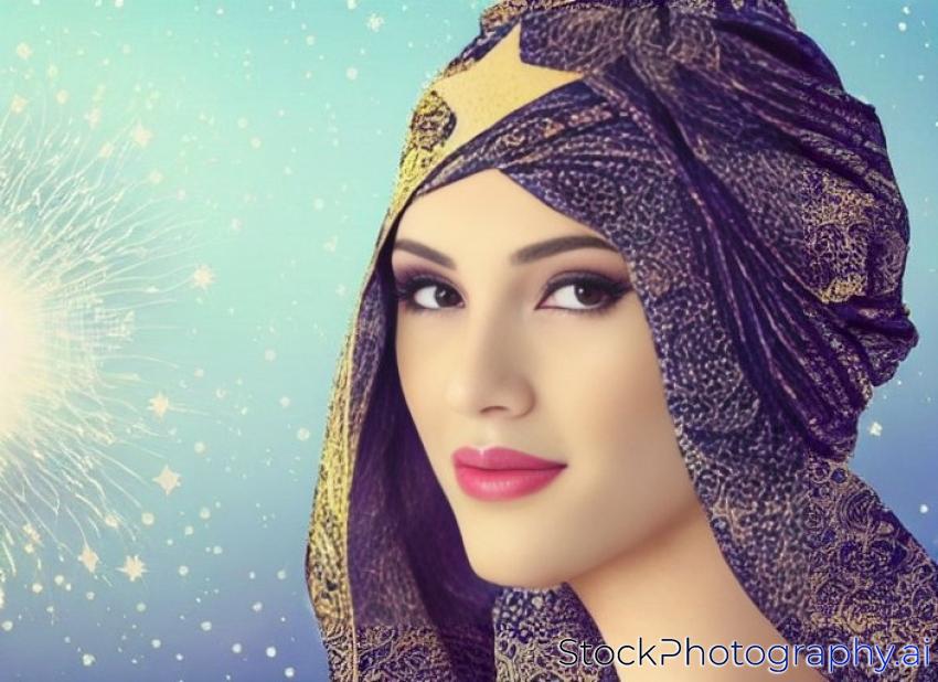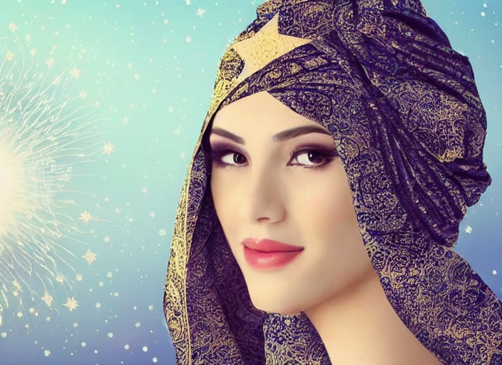 beautiful stylish woman in oriental style with mehendy wearing in turban . night. sky with stars.