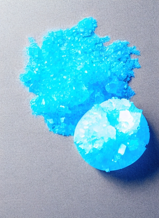 big beautiful bright delicate unusual blue crystal ammonium phosphate, ammonium sulfate-colored potassium alum, sodium chloride and food coloring E133 on a gray background with reflection
