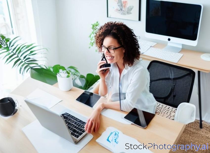 bird view of happy smiling remote online working woman talking on the mobile phone with laptop, notebook and glass in casual outfit sitting on a work desk in her living room in home office
