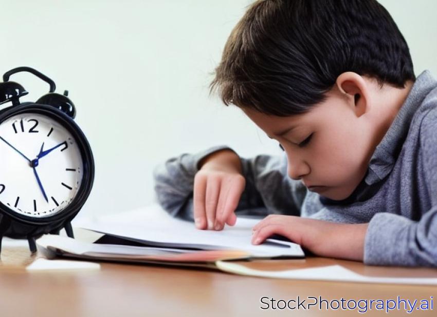 black round clock shows time, schoolboy is sleeping while doing homework on laptop. Too much homework make children exhausted. Home education concept