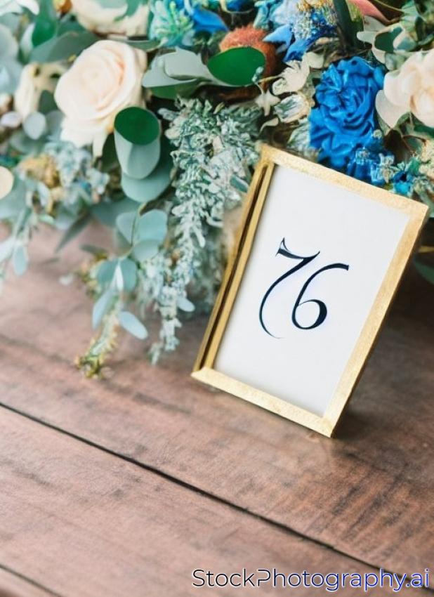 bohemian blue wedding table number on a wooden table, eucalyptus and gold decoration, watercolor style, bokeh background