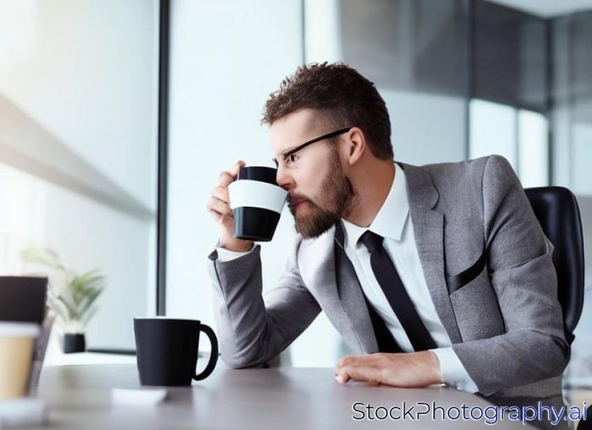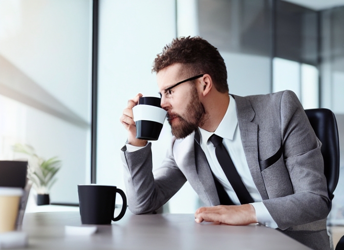 business man in the office drinking coffee and talking on the touch tablet phone gadget.