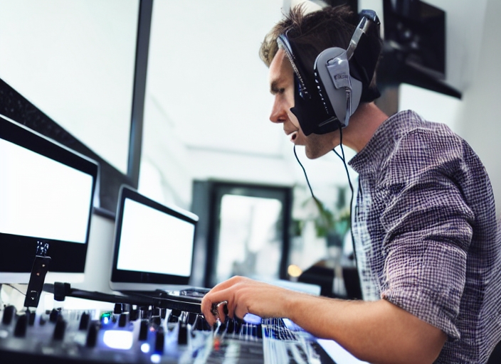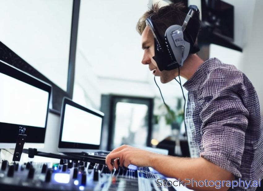 caucasian male dj playing mp3 music with computer and mixer