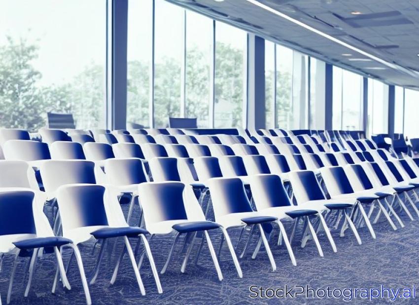 chairs on stage in conference hall at business event or seminar meeting, business and education concept