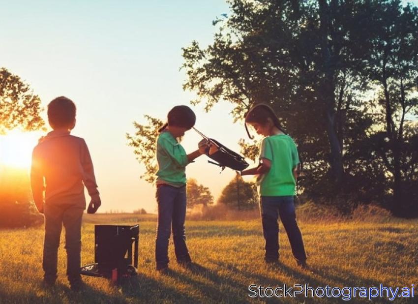 children operating of flying drone at sunset