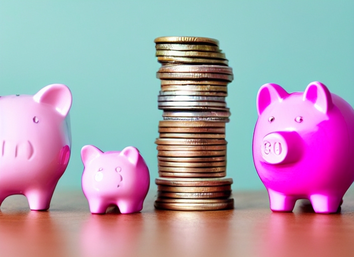 coin stack and pink piggy bank, saving money concept.