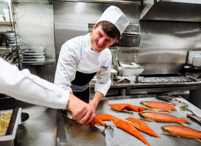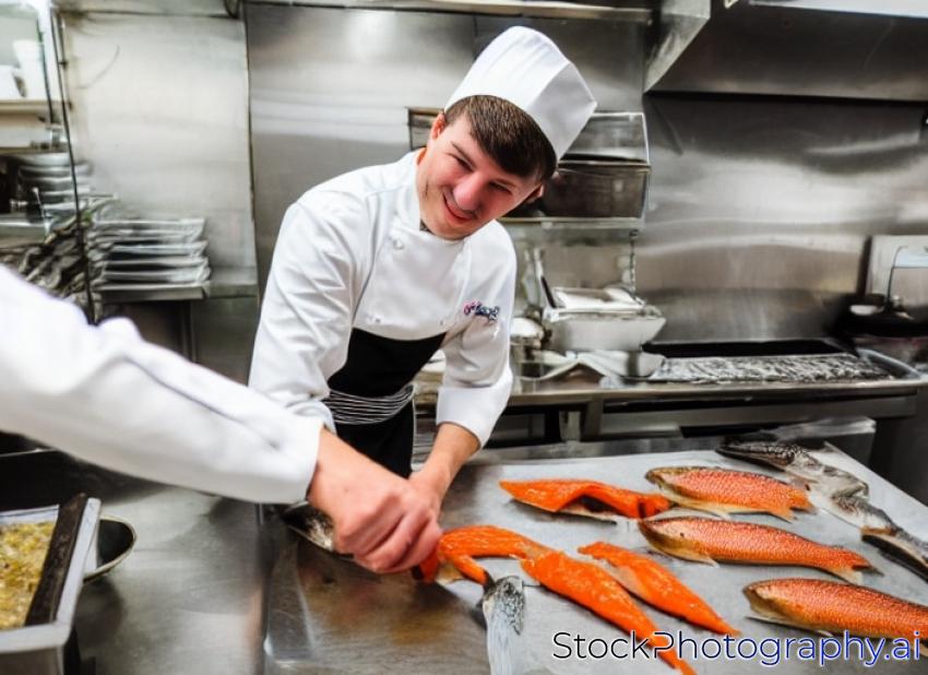cut fish fillet in a fish shop, chef cutting trout fish in the kitchen