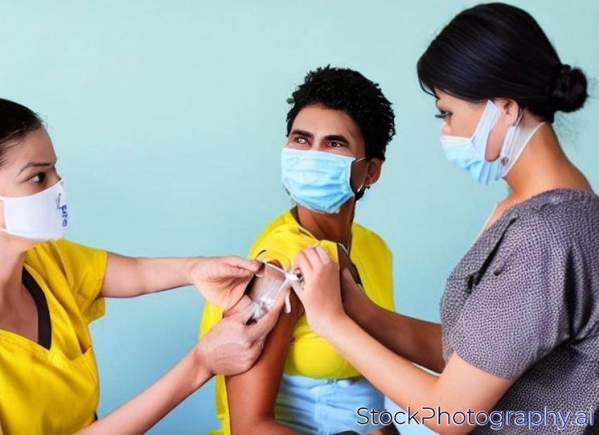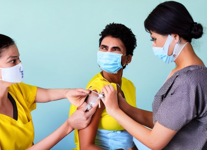 doctor hold syringe in hand medical mask female patient in yellow t-shirt covid vaccination