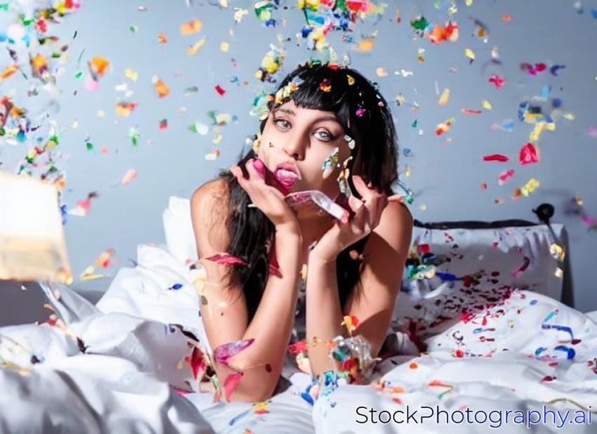 drunk woman lying on bed after celebrating new year 2021 at home quarantine. lockdown. confetti falling. girl holding glass of Champagne. 2020 end. 2021 start.