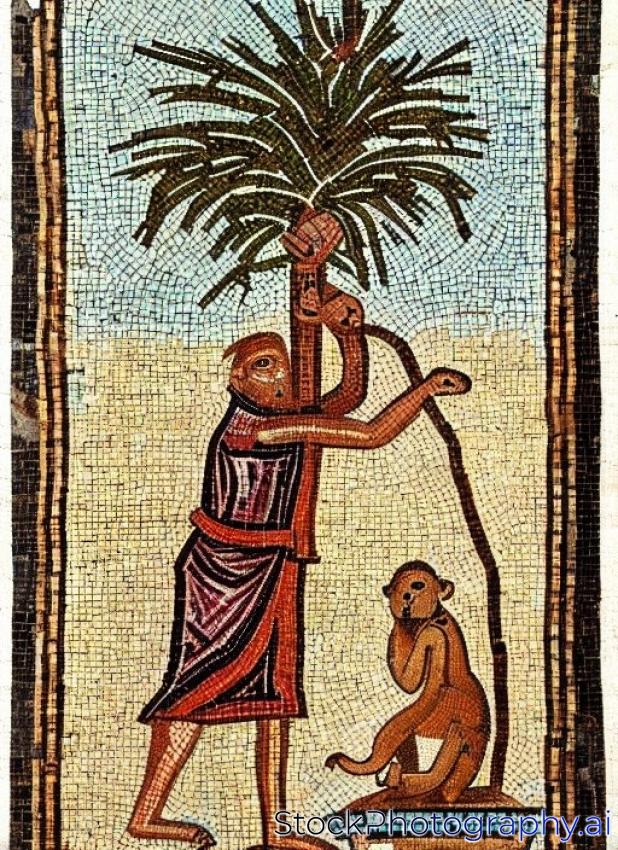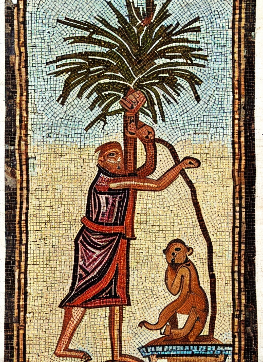 famous ancient byzantine mosaic of a trained monkey collecting dates from a date palm using a pole. the monkey carries a cage with a falcon on it.