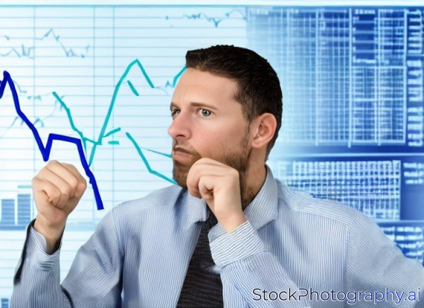 figure look skeptically on graph with stock prices