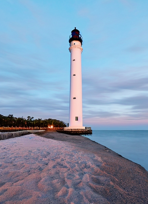 florida's historic hillsboro lighthouse shining before dawn beside the ocean inlet and jetty, actual beam