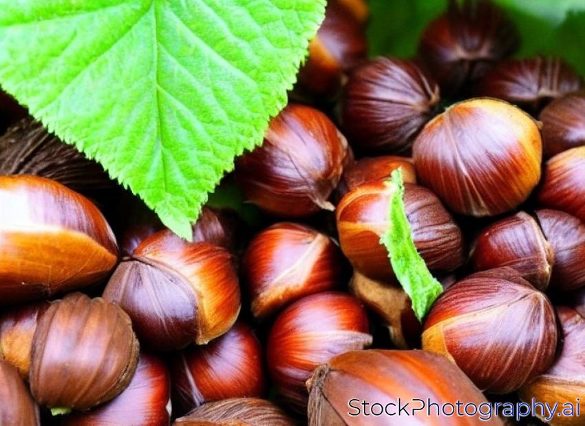 freshly harvested chestnuts. Unripe chestnut hedgehogs blurry in the background