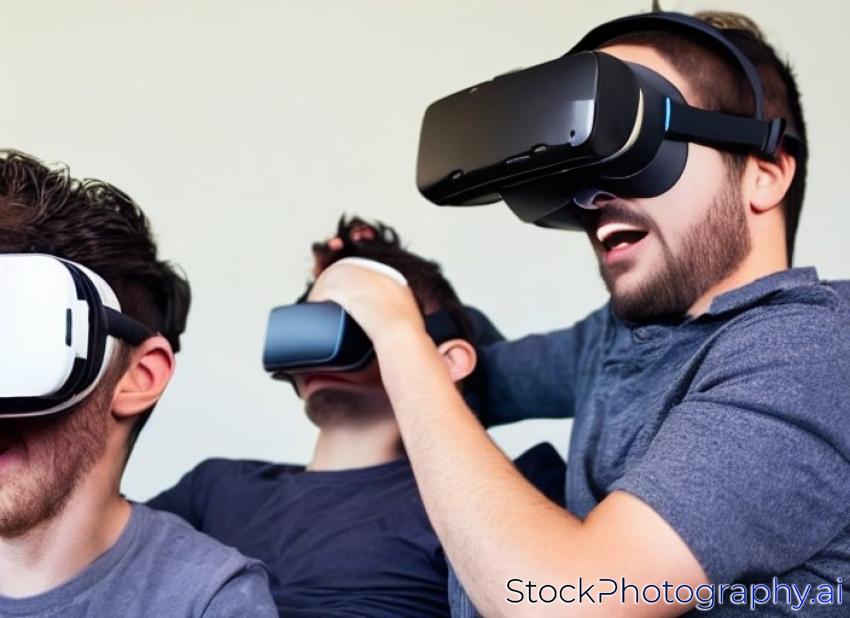 frightened father and son in vr headsets experiencing Virtual reality on couch at home