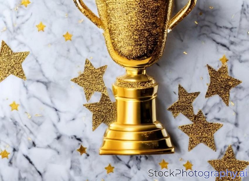 golden trophy on a marble table with stars confetti