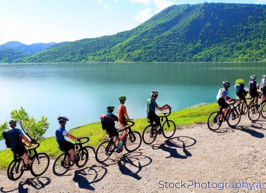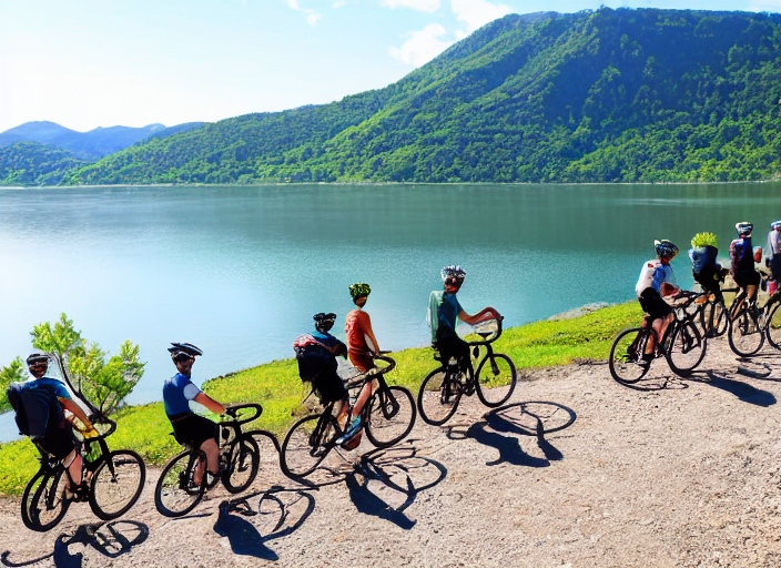 group of cyclists on the shore of a mountain lake. team outdoors. mountain bike