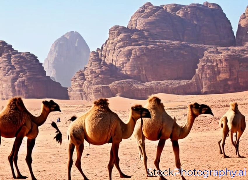 group of wild camels in the Wadi Rum desert