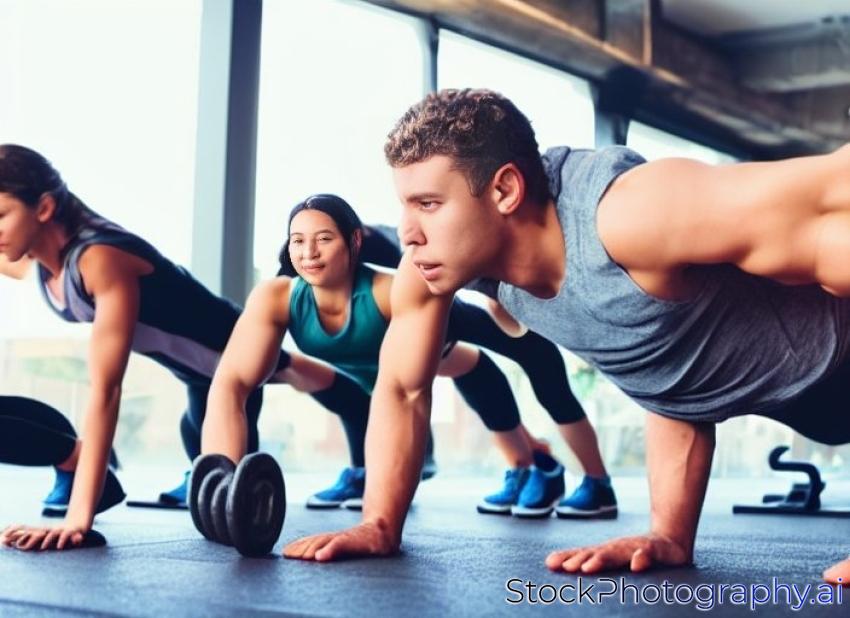 group of young healthy people doing pushups at a gym