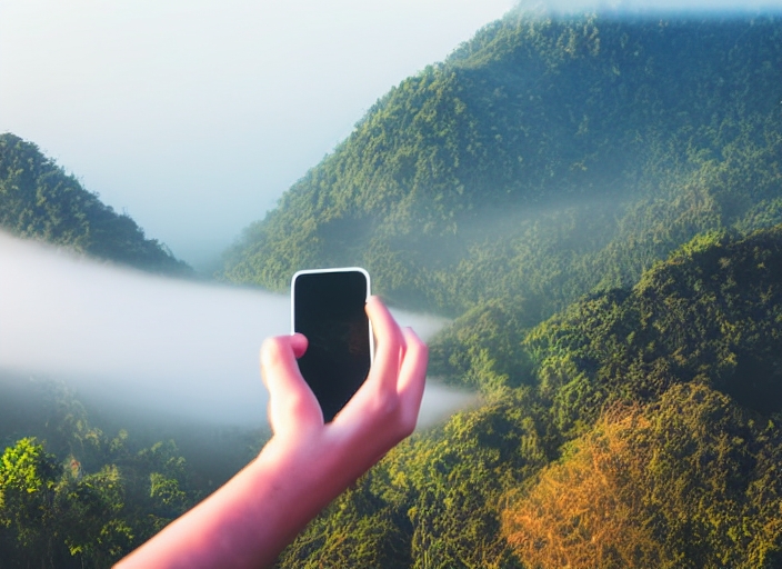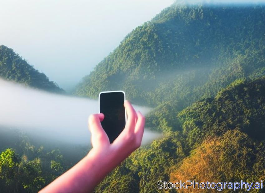 hand holding smartphone take photo with View of mist on Phu Thok Mountain at Chiang Khan at morning, Loei Province in Thailand. subject is blurred and low key