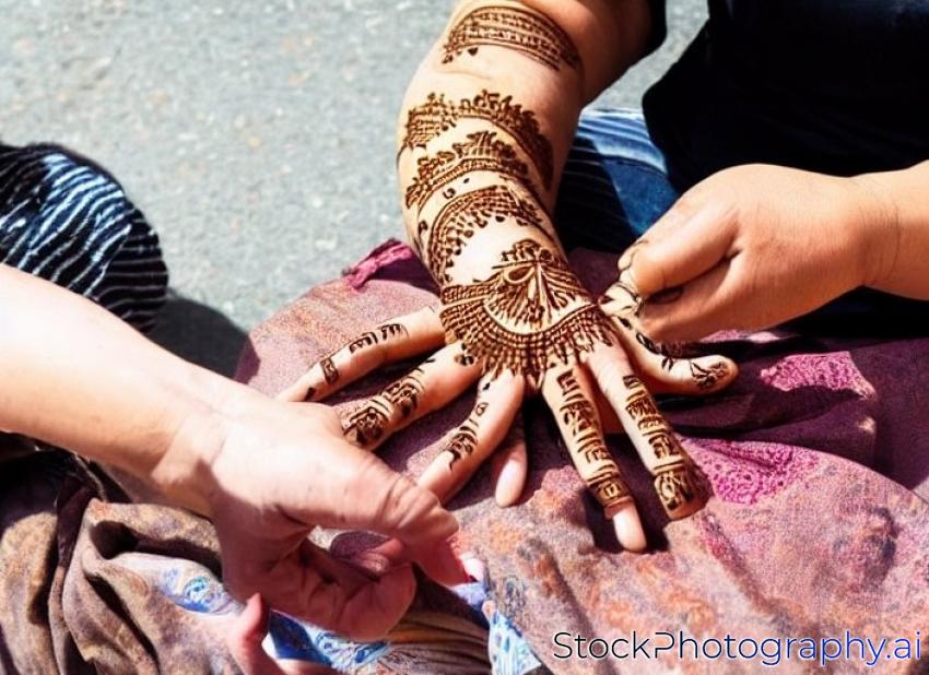 hands of a tourist in henna tattooing process on the street, experimenting with local traditions