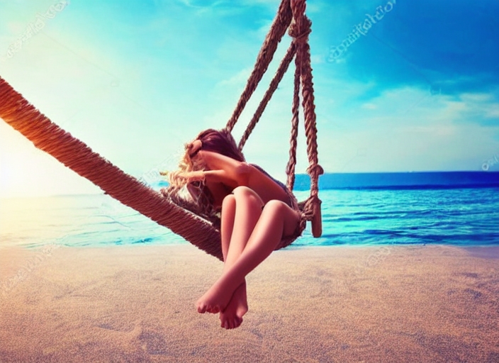 happy summer beach holidays, beautiful girl relaxing on swing at sunny sunset, enjoy getaway travel vacation at sea, happiness concept