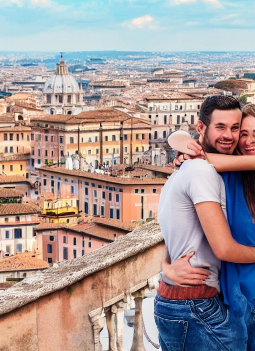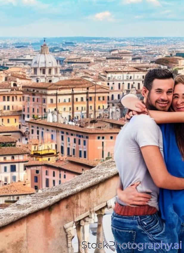 holidays, travel, tourism, people and dating concept - happy couple hugging over rome background