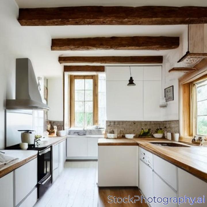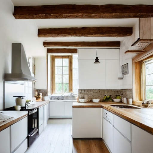 interior of a kitchen in the countryside with white wooden floor and ceiling