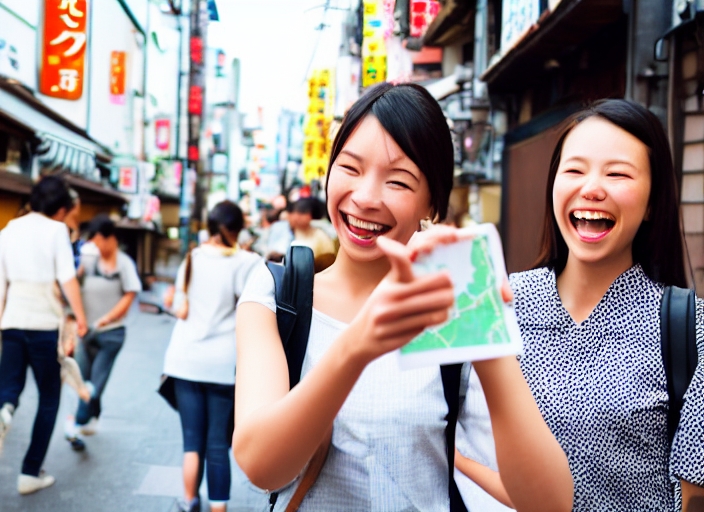 joyful girl tourist holding online map and searching the restaurant for lunch in japanese local izakaya. young female traveler cheerfully pointing finger to destination on teeming street osaka japan.