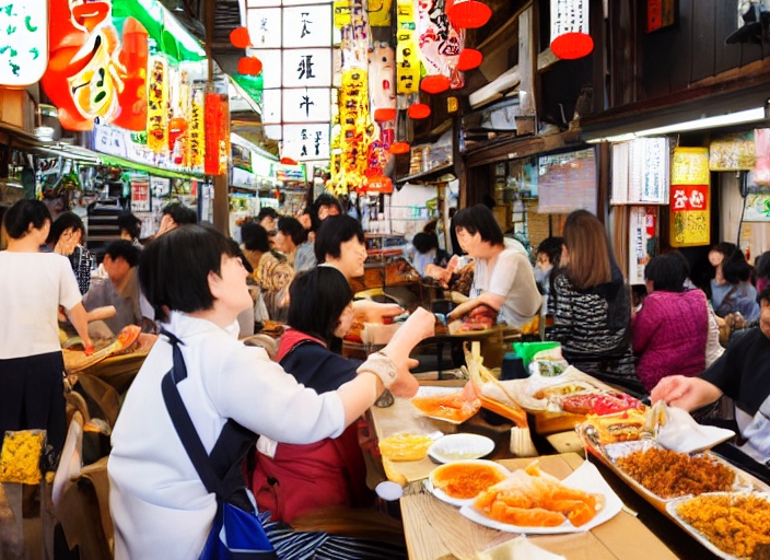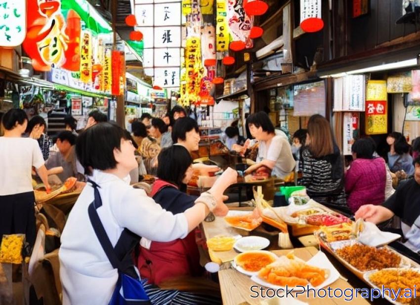 joyful woman experience local japanese culture eating tasty yakitori. cheerful tourist eating in indoor market in Japan. teeming market in osaka.