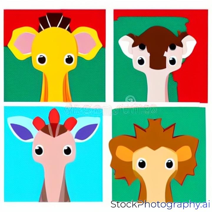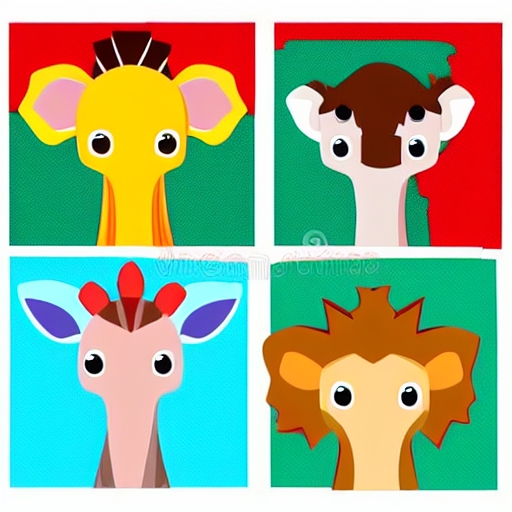 little giraffe, elephant, zebra and lion on white background in red border - kid bitmap illustration