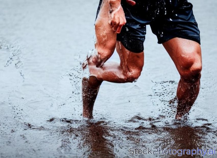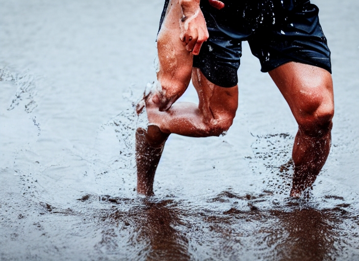 male athlete with tape on his knees running through a puddle of water, splashes and drops around feet