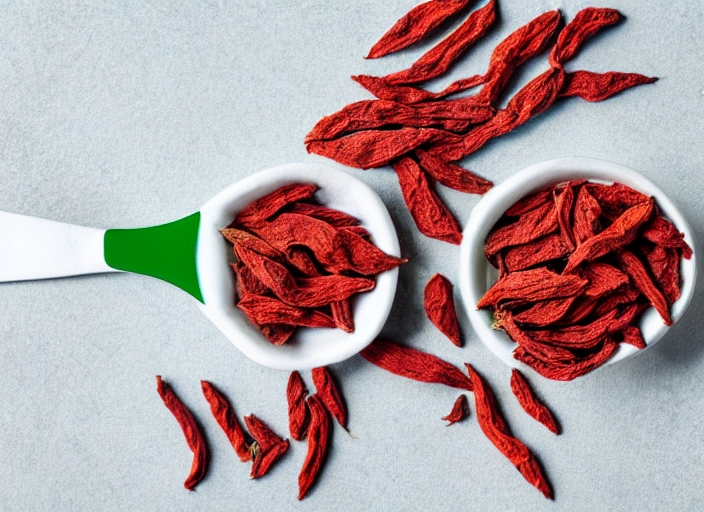 metal measuring scoop of dried goji berries against white art canvas with a green goji bush twig