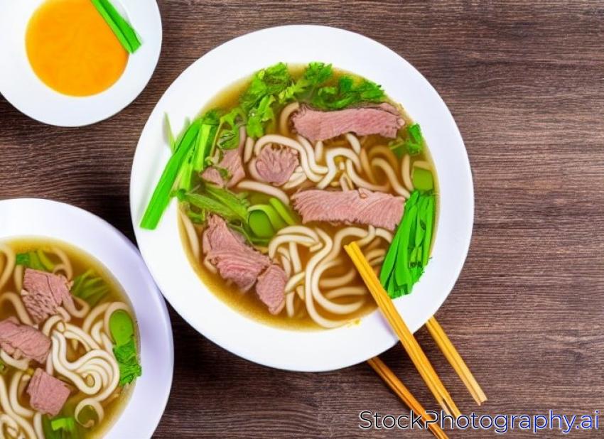 mi goi, noodle soup with meat on white